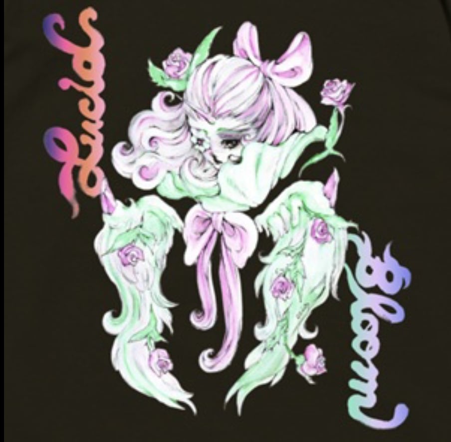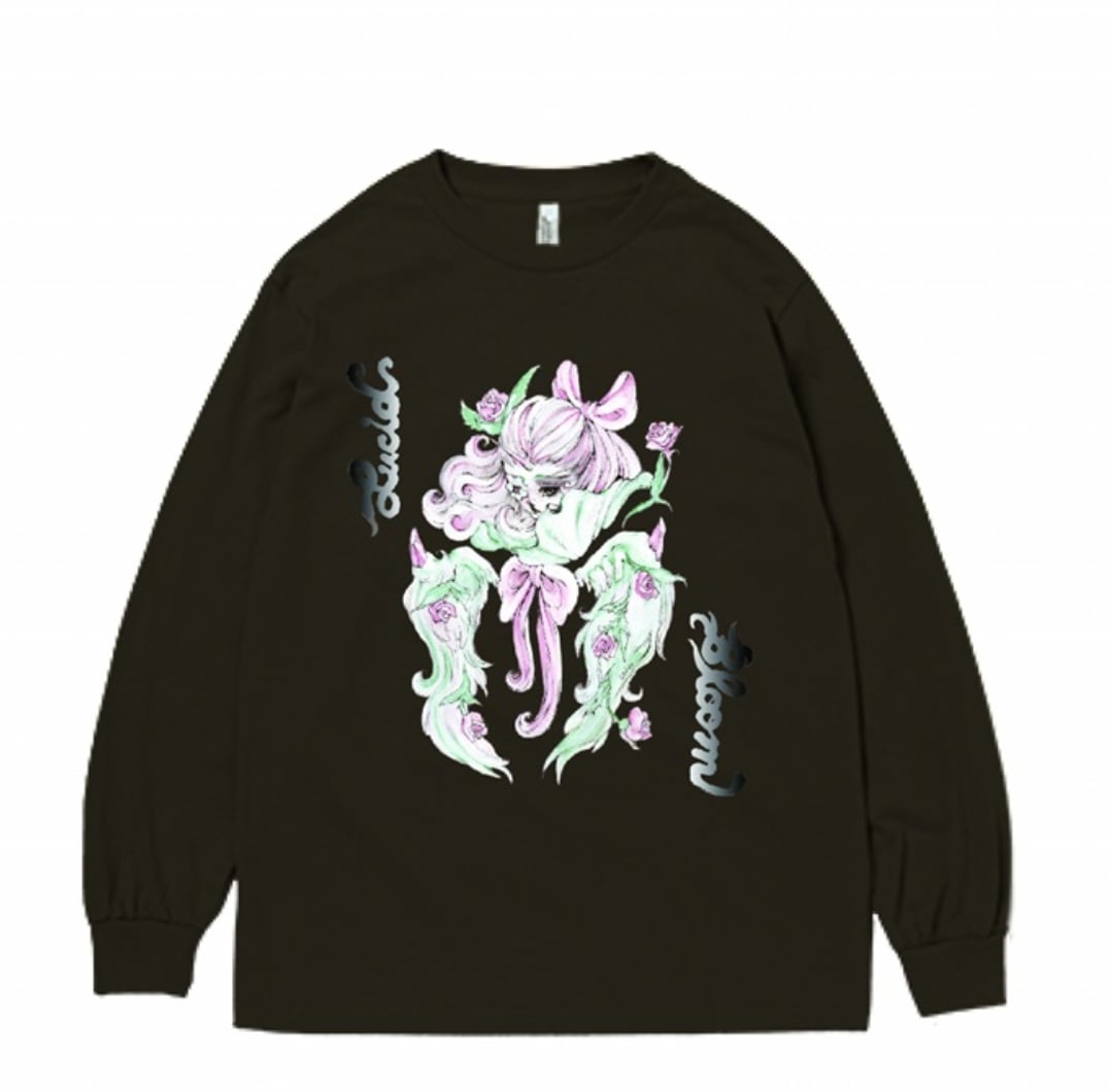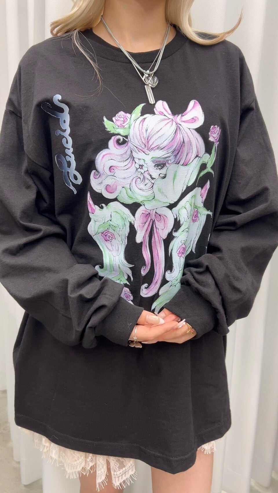 背面にワンポイント、前面プリントの長袖Tシャツです。